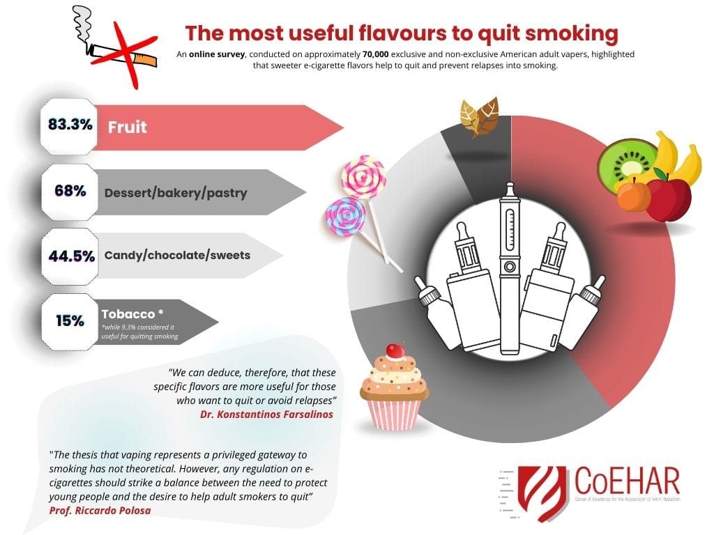 An online survey, conducted on approximately 70,000 exclusive and non-exclusive American adult vapers, highlighted that the most utilized flavors to quit smoking are those of fruit, baked goods, and chocolate. These flavors are considered helpful in preventing and reducing the risk of relapses, but concerns about youth addiction are pushing government to enact strict state regulations