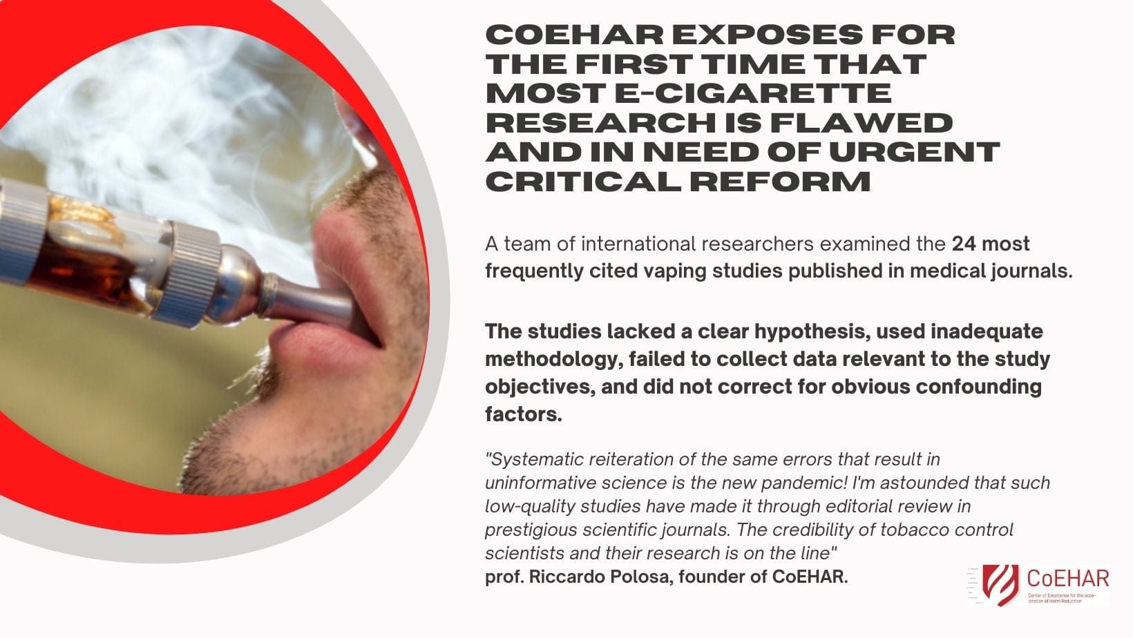 Under the leadership of CoEHAR, a team of international researchers, examined the 24 most frequently cited vaping studies published in medical journals. The findings are shocking: almost all of these studies were found to be methodologically flawed; they lacked a clear hypothesis, used inadequate methodology, failed to collect data relevant to the study objectives, and did not correct for obvious confounding factors.