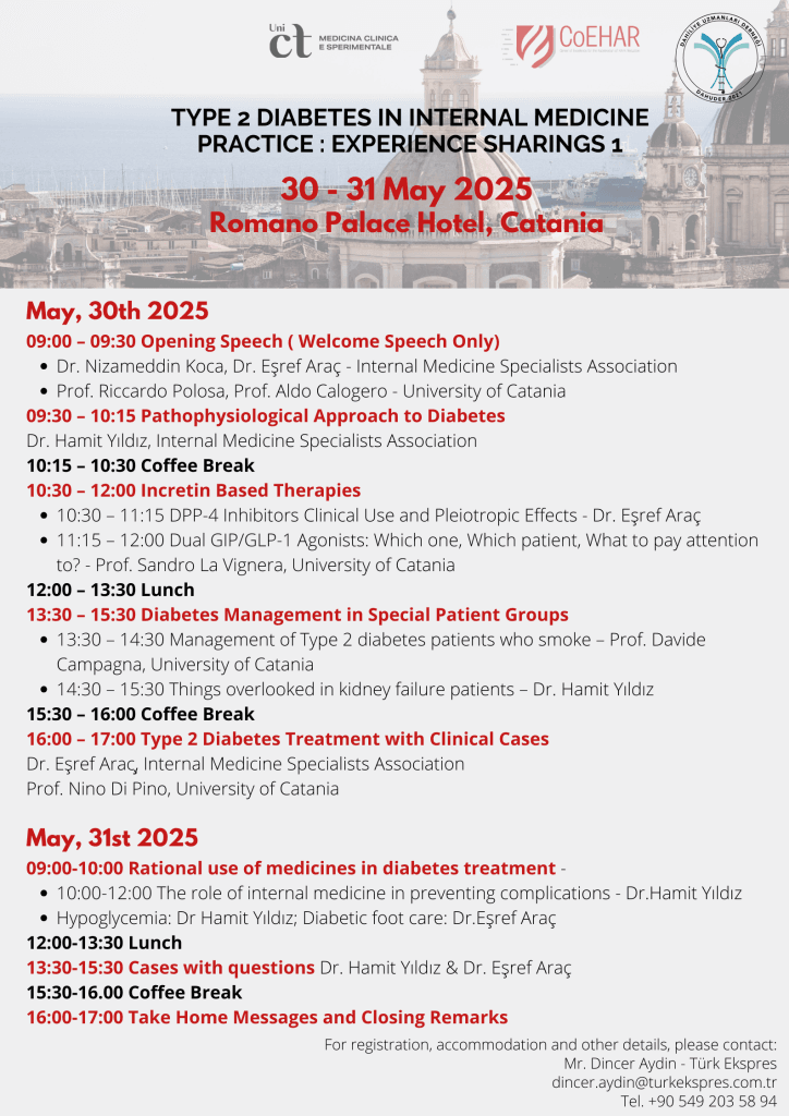 The University of Catania is proud to announce the upcoming international scientific conference titled “TYPE 2 Diabetes in Internal Medicine Practice: Experience Sharings 1”, which will take place on May 30-31, 2025, at the Romano Palace Hotel in Catania. This event will bring together over 100 specialists from the fields of internal medicine, diabetes, and public health health to discuss the latest advancements and challenges in diabetes care, with a particular focus on personalized medicine and tobacco harm reduction. Professor Seyit Uyar, President of the Internal Medicine Specialists Association (DAHUDER) in Turkey, will co-host the event with CoEHAR (Center of Excellence for the Acceleration of Harm Reduction).