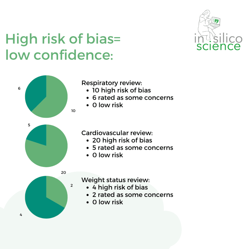 Other sources of bias we identified were (1) the absence of a published protocol, (2) unexplained deviations from the protocol, (3) small sample sizes, (4) participants not representative of actual smokers, and (5) e-cigarette exposures far greater than real life use. Some studies used different e-cigarette models, which complicates interpreting the results.