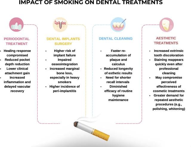Beyond the well-known risks of lung and heart diseases, cigarette smoking negatively affects both the effectiveness of preventive dental treatments and the progression of diseases affecting the gums and teeth.