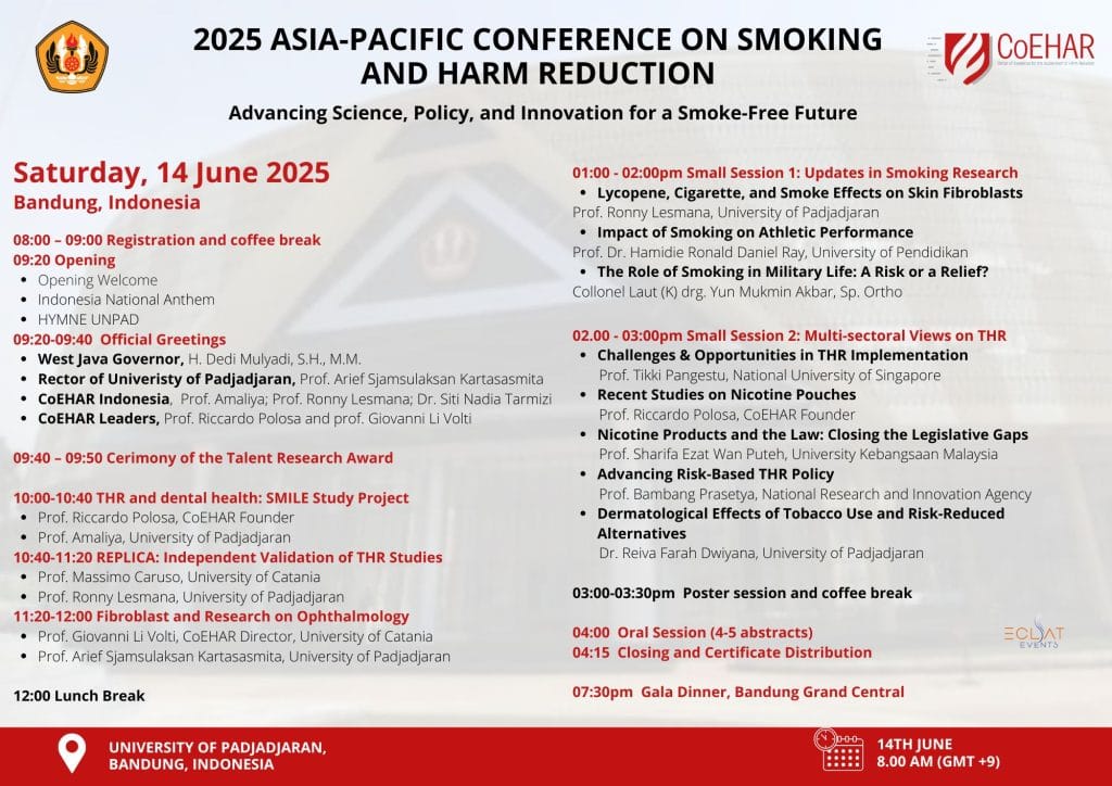 Bandung, May 20, 2025 – The first Asian conference on smoking harm reduction, promoted by CoEHAR, is set to kick off in Bandung. On June 14, the “ASIA-PACIFIC CONFERENCE ON SMOKING AND HARM REDUCTION” will take place at Padjadjaran University, sponsored by CoEHAR and organized in collaboration with the Indonesian University.