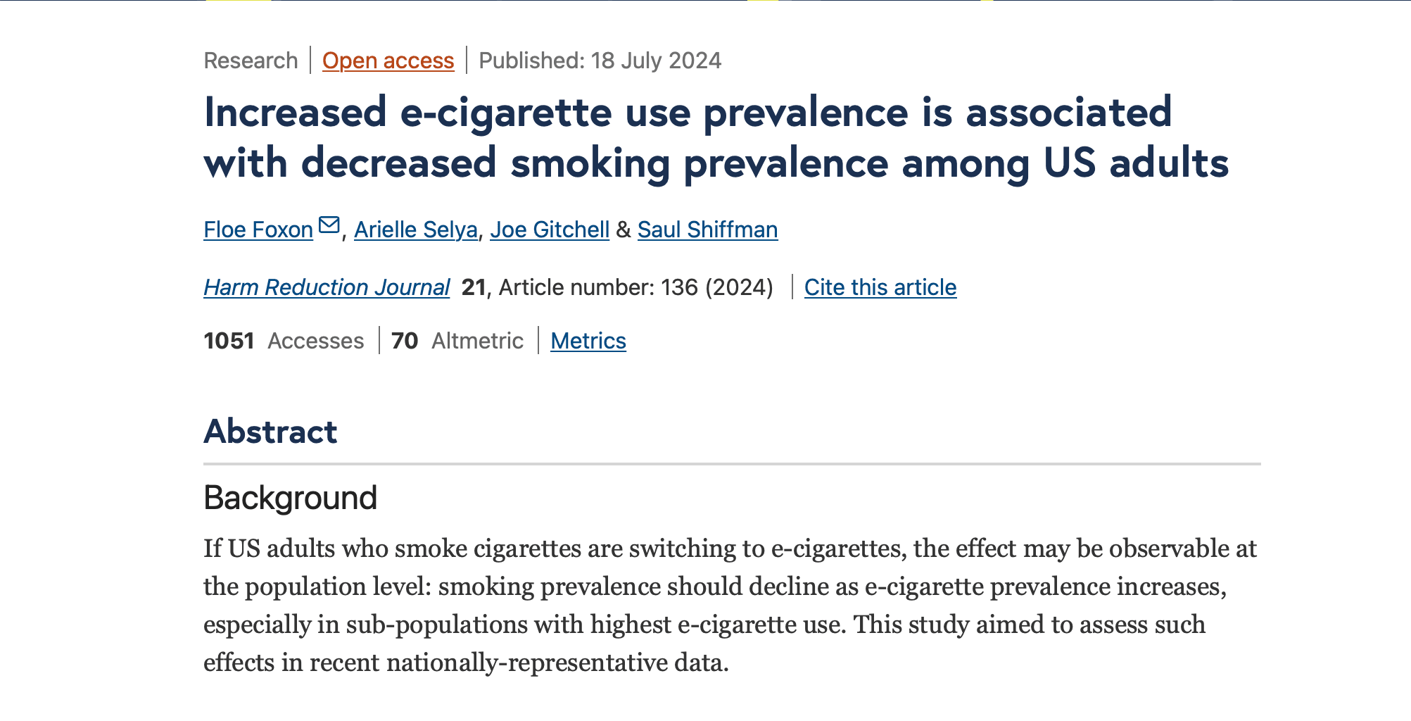The new analysis “Increased e-cigarette use prevalence is associated with decreased smoking prevalence among US adults” published in the Harm Reduction Journal is an update on a previous analysis modeling population-level prevalence that assessed whether and how much the introduction of e-cigarettes in the US may be correlated with declining smoking prevalence among populations of US adults using the National Health Interview Survey (NHIS) .
