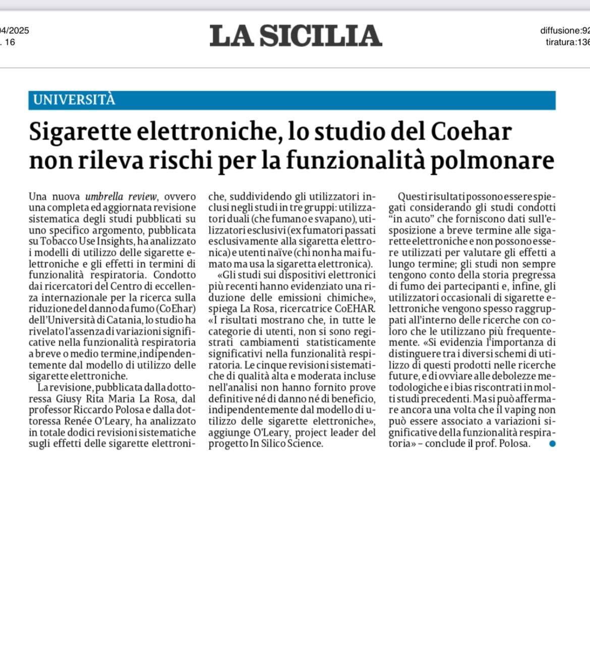 • La Sicilia - April 03, 2024 - Sigarette elettroniche, lo studio del CoEHAR non rileva rischi per la funzionalità polmonare